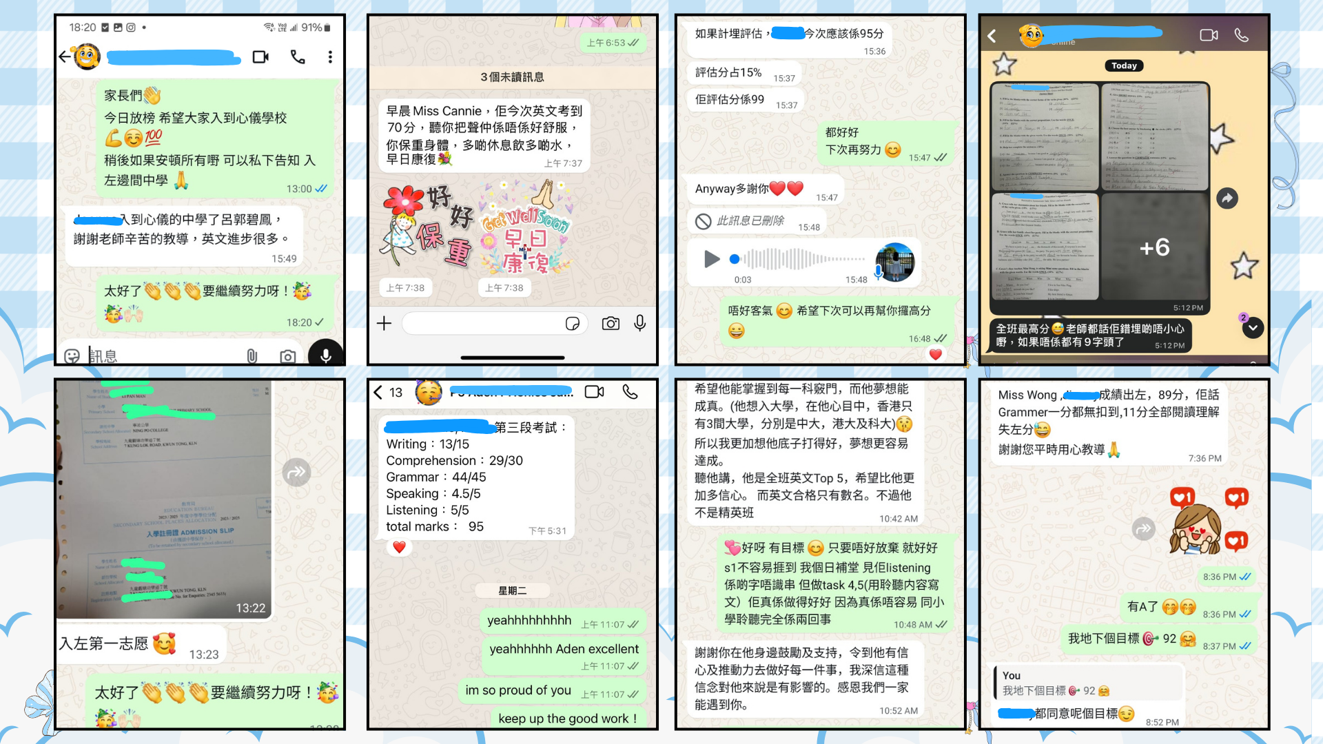 第一志願的喜悅: 我們每年都會收到「入咗第一志願」的升中喜訊。我們不僅提供補習,更在選校與面試路上與家長並肩作戰。
